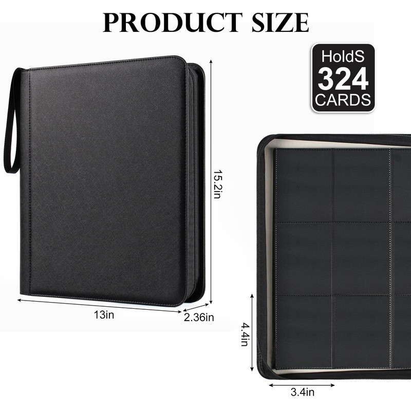 Our binder for top loaders can hold up to 324 toploader cards. It is designed for collectors who have tons of nice sports cards or collectible cards in top loaders that just sit in boxes. With this waterproof protective card binder, you are able to bring with to card shows or trade days.