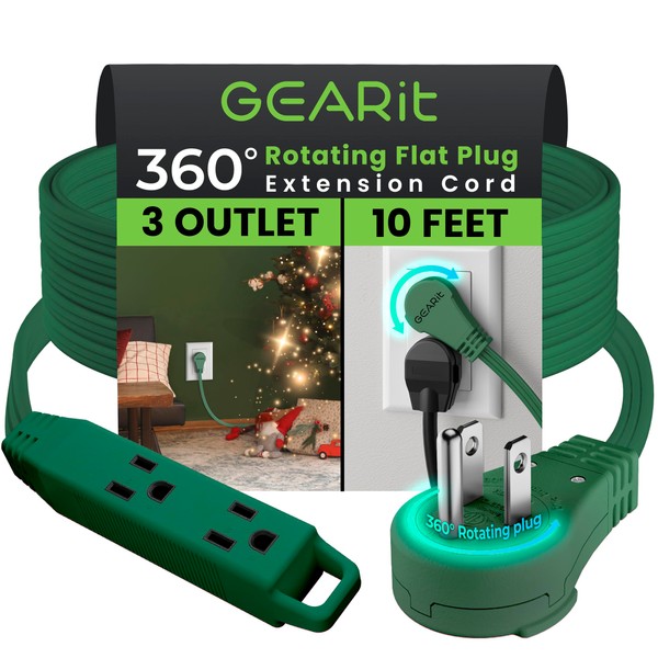 GEARit 360 Rotating Flat Plug Extension Cord with 3 Outlets (10ft, Green) 16AWG/13A 3 Prong Wire, Outlet Saver for Home Office Dorm Room Essentials, ETL Certified