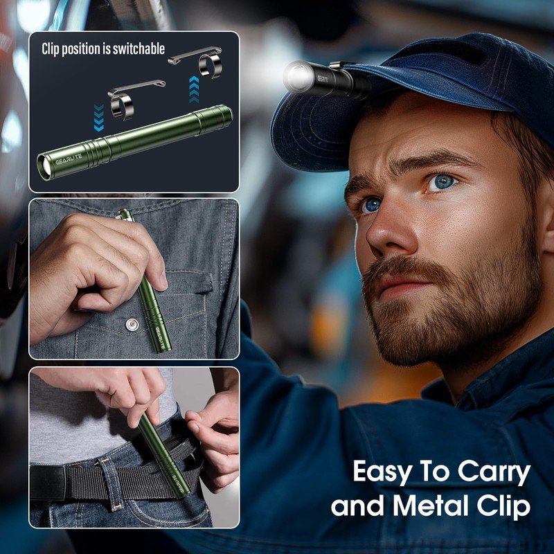 - Portable & Lightweight Pen Flashlight: The mini torch is very compact, only 13.4 cm long and weighs only 29 g. So that small flashlight can be easily put in your pocket or backpack. It is equipped with a removable clip, and can also be attached to a belt, hat or notebook to have your hands free and comfortable to carry