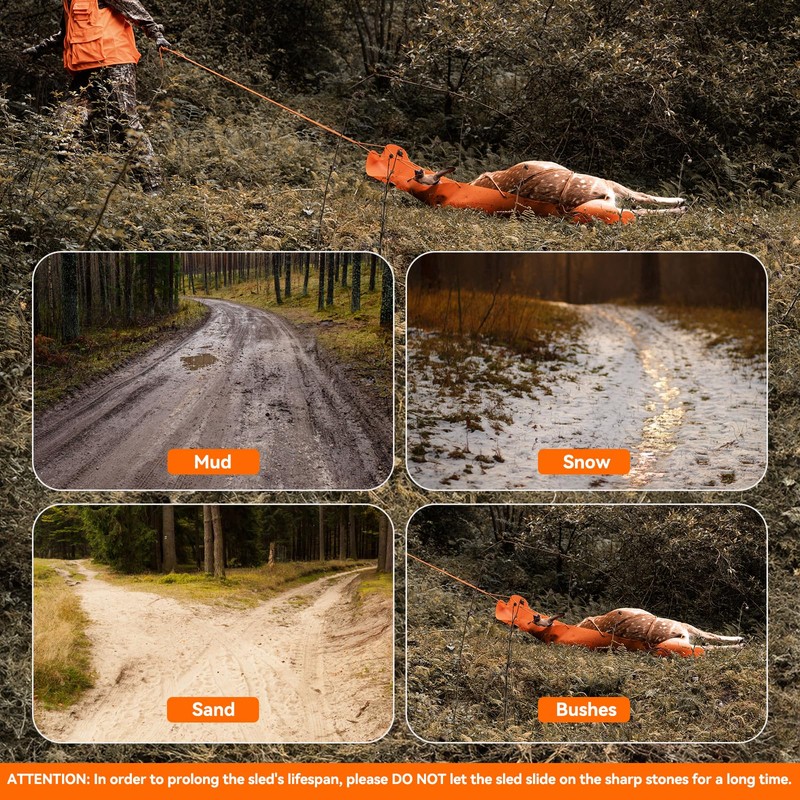 - 🦌✅[Make Dragging Easier] GearOZ deer sled changes the old way of harvesting. It comes with 2 sturdy ergonomic handles, providing a more effortless and labor-saving experience while dragging. Besides, the smooth material reduces friction on the ground, allowing the sled to move quickly in places where vehicles cannot pass or on rough mountain roads. This design gonna protect your shoulder and back while pulling, even alone/elder/women can easily harvest their game.