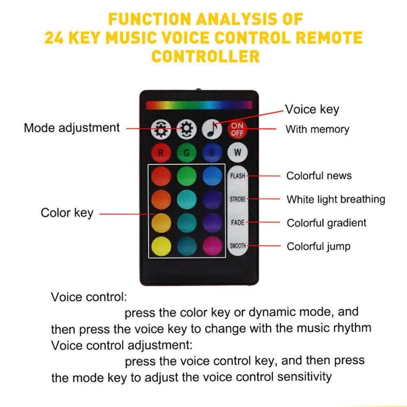 - Remote mode:Static 16 color (red, green, blue, yellow, mixed white, pure white, cyan, purple, etc.) and RGB light change, fade, jump, spark and adjust brightness, mode speed and sound sensitivity adjustment.
