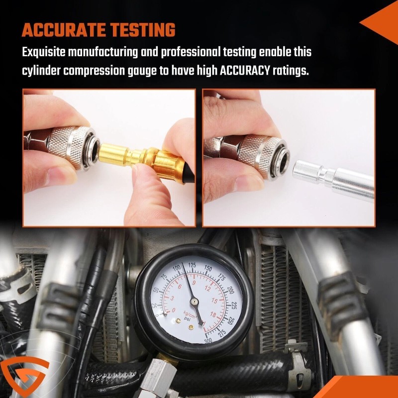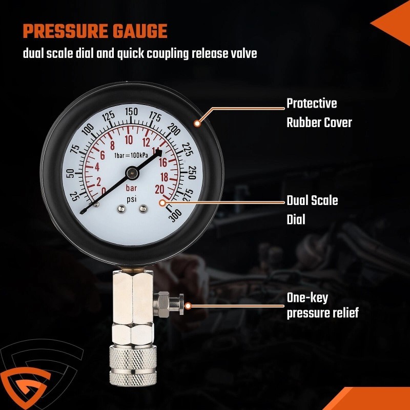 【Stable quality tester】: Maximum 300PSI or 20BAR dual pressure device, with easy-to-read large dial, acrylic glass meter cover with scratch-resistant coating and rubber protective cover with excellent shock absorption performance. The built-in one-way valve with pressure holding function ensures that the pressure gauge obtains the maximum pressure at the spark plug during the compression process.
