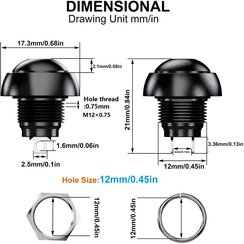 - Push buttons hole diameter: 12mm, Push buttons hole thread: 0.75mm. Screw design allow the installation easier, come with 12pcs nut and 12pcs spacer make the installation more stable.