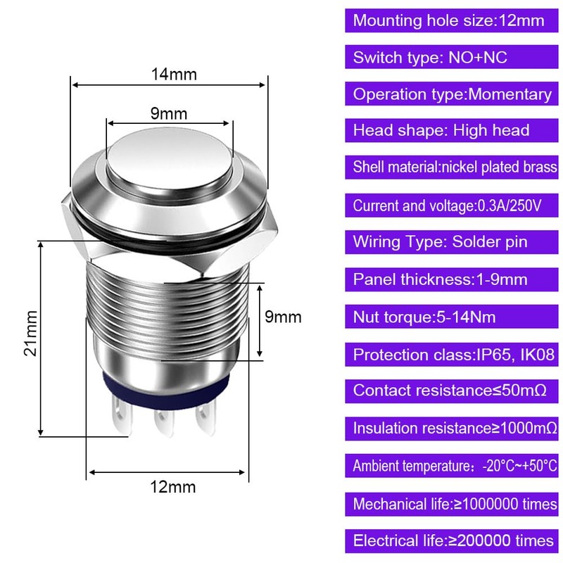 - Mounting Hole Diameter: 12mm, Push Button Hole Thread 0.75mm