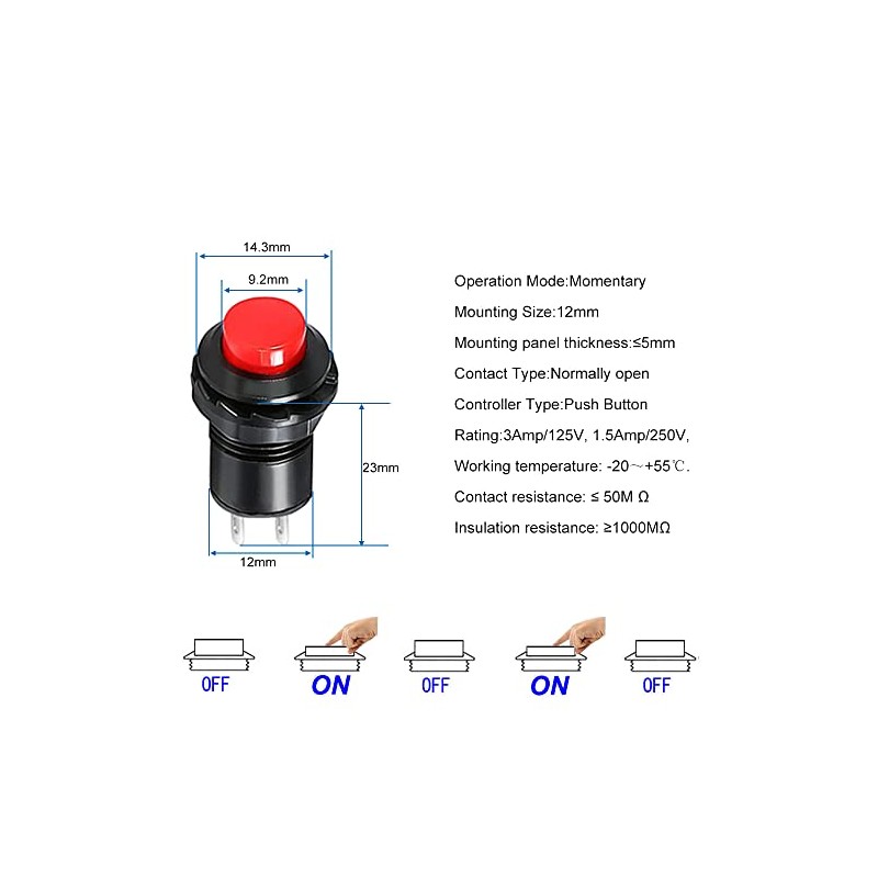 - Rated voltage: AC 250V/1.5A 125V/3A , Size: 3.0 x 1.6cm/1.2 x 0.63 inch, 2 pins. Press the button, power on; release it, power off.