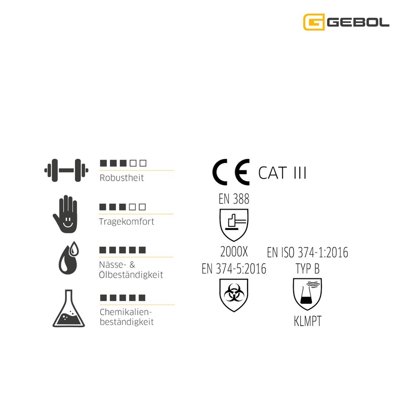 - Protection - The Gebol Carostar chemical protection glove reliably protects against acids, alkalis, fats and oils.