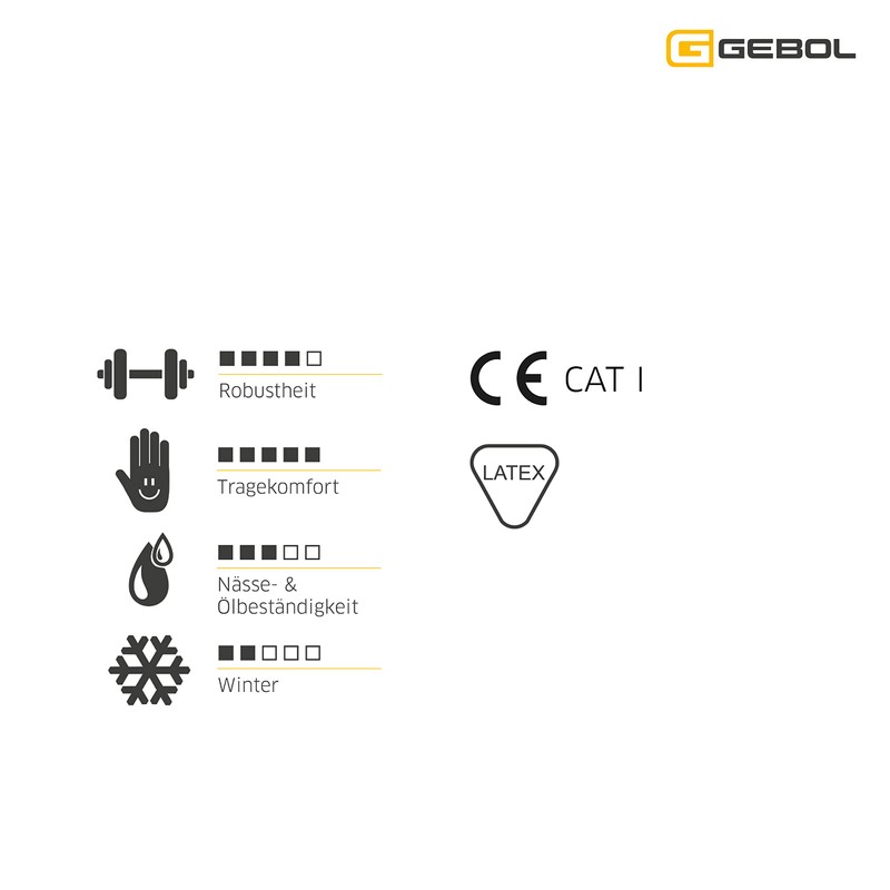 - Grip safety - The latex foam coating on the palm ensures a secure grip even during wet and slippery work. In addition, the coating protects against penetrating moisture.