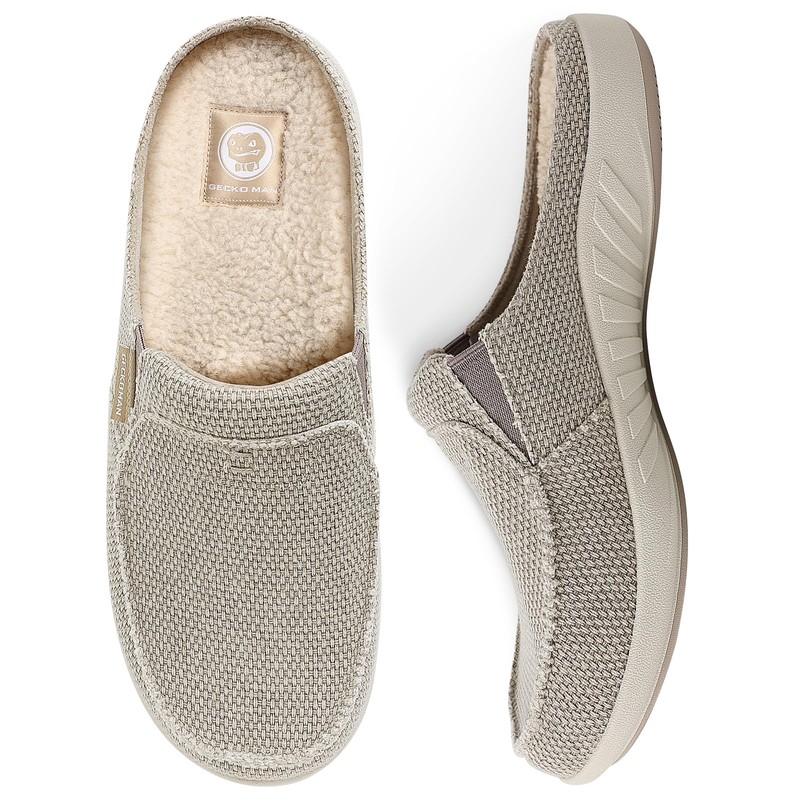Gecko Man Canvas Orthodontic Slipper for Men with Fuzzy Wool Insole and Velvet Lining, Slip on Clog House Slipper with Indoor Outdoor Anti-Skid Rubber Sole, Beige, size 8 US
