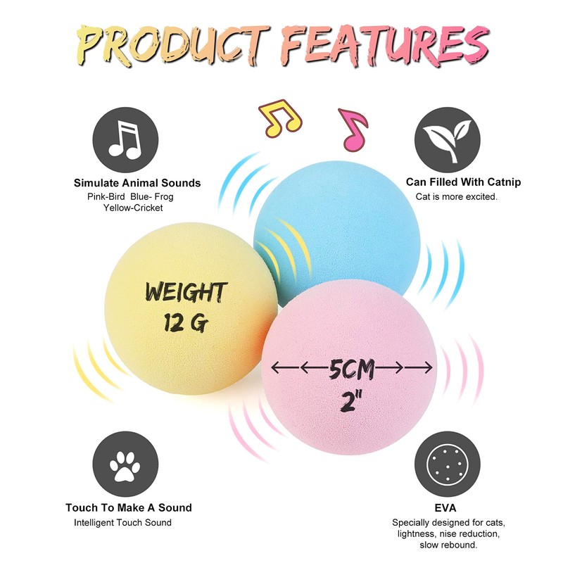 - 3 DIFFERENT KINDS OF LIFELIKE ANIMAL SOUNDS: Interactive cat toy contain multiple animal voice of frogs, crickets and birds. Cat ball with different colors has different sounds. Stimulates cat Instinct to hunt. It can last 10,000 times of chirping.