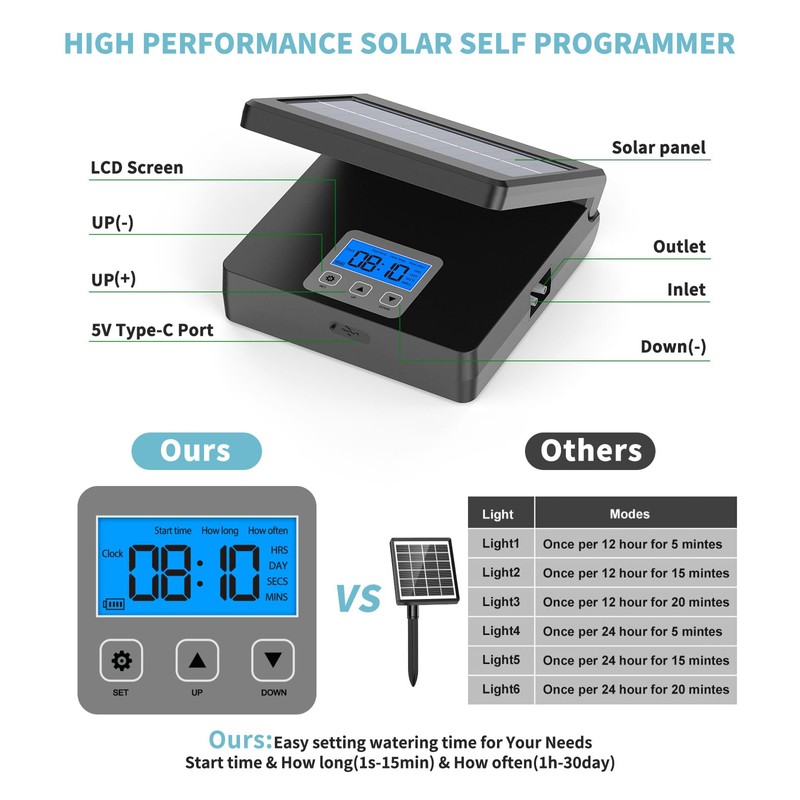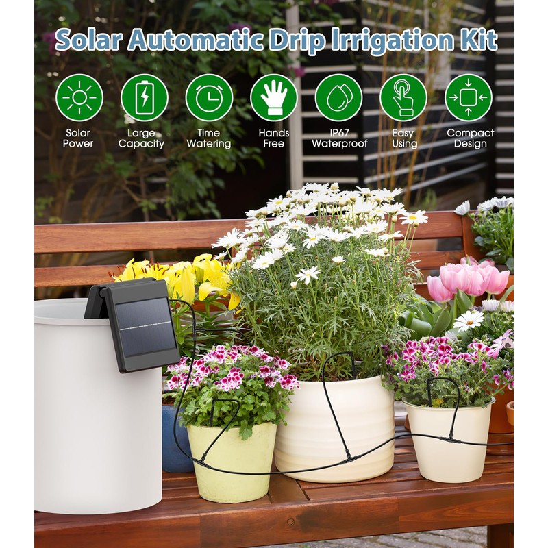 Gedfong Solar Bewässerungssystem, Solar Automatisches Bewässerungssystem mit LCD Programmierbarer Timer, IP67 Wasserdicht Solar Automatische Bewässerung für Zimmerpflanzen Balkon Garten