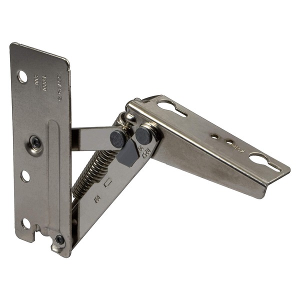 - Safety: cabinet hinge – material: solid steel – surface: nickel-plated metal – spring force: 240 N – adjustable opening angle limitation 75° or 90° – body height up to 600 mm – flap weight max. 6.2 kg - with automatic tilt and opening angle limiter - height adjustment: ±3
