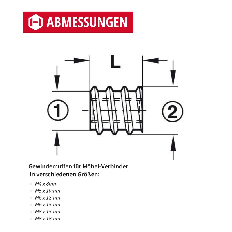 • Robust threaded bushings for invisible screw connection and very stable attachment of furniture, benches and much more. Ideal for flush countersinking into wood without a gap. Used in furniture, wood panels, chipboard, tables, chairs, worktops, etc. The nuts "disappear" completely into the wood and spread out when screwing in threaded screws. The high tensile loads allow a flush, stable and clean connection and secure screw connections of furniture parts - cupboards - trays - etc.