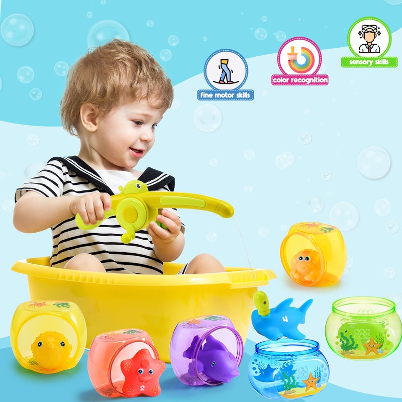 - Great for learning: these mould-free bath toy fish are one of the great tools for children to cultivate hand-eye coordination, body balance and colour identification when the babies play the fishing game in the bath, do well in the early development of children. Attract baby's attention, stimulate the brain's thinking ability.
