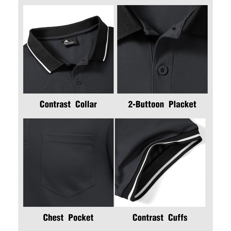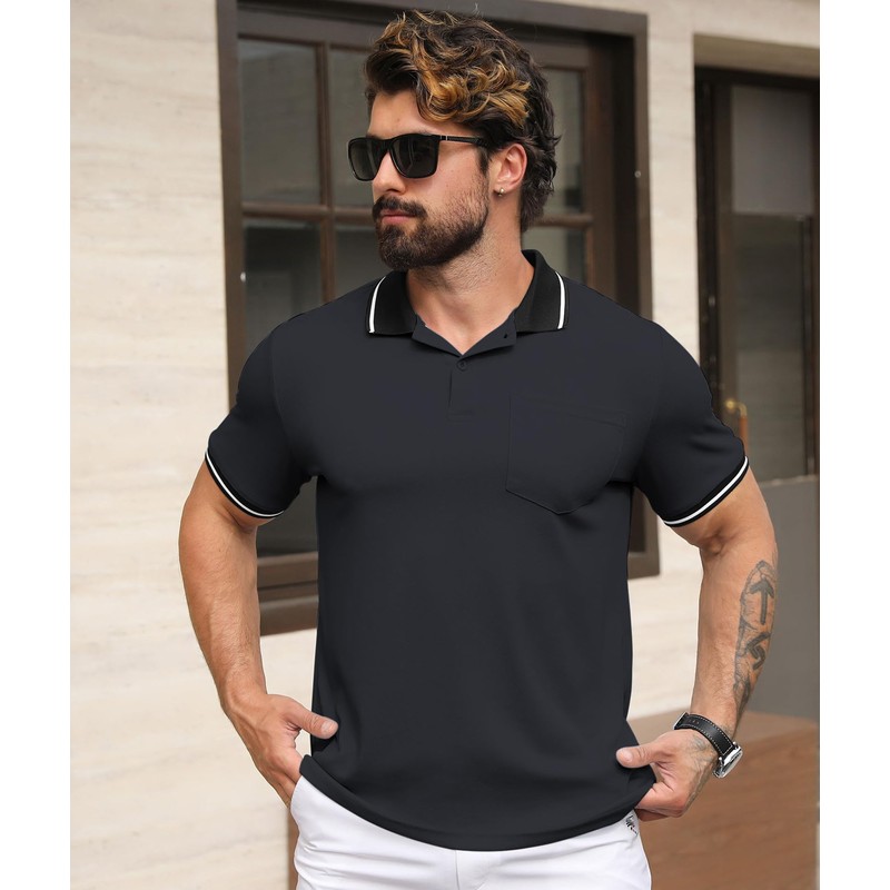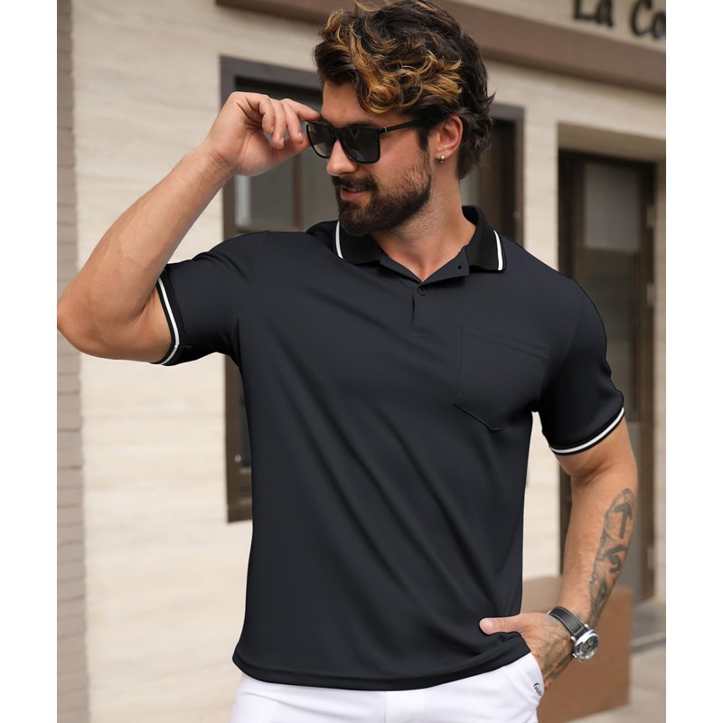 - Design: It features a classic casual polo design with two-button closure and contrasting color on the collar and cuffs, adding a sense of design and fashion to the garment. The pocket on the left chest is convenient for holding small items like keys, Bluetooth earphones, and more