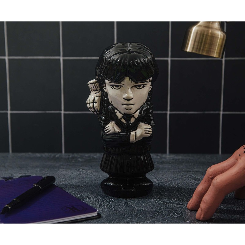 - WEDNESDAY GOES TIKI: From the popular Addams Family spinoff comes Wednesday as a collectible Geeki Tikis mug. Satisfy your thirst for spine-chilling tropical refreshments with the child of woe to inspire you.