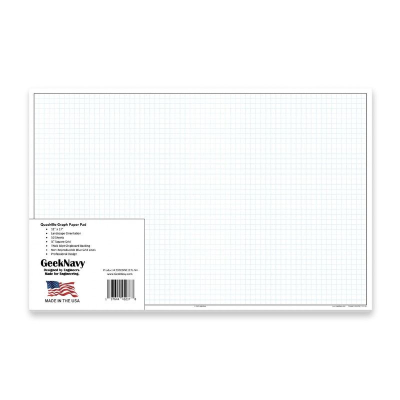 GeekNavy 11" x 17" Quadrille Graph Paper 50 Sheets Landscape - 0.25" 4x4 Square Grid, Blueprint, High Brightness, Border-Outlined, Large Drafting (1-Pack)