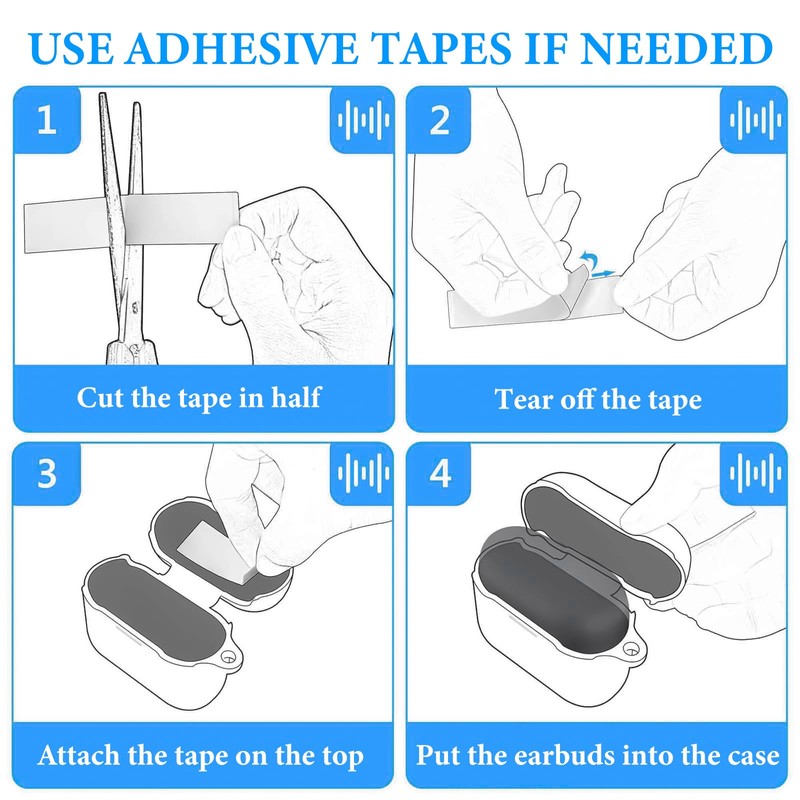 • Tiras adhesivas en el interior para un ajuste más seguro. Portátil con gancho para llavero. Corte especial para cargar tus auriculares sin quitar la funda.