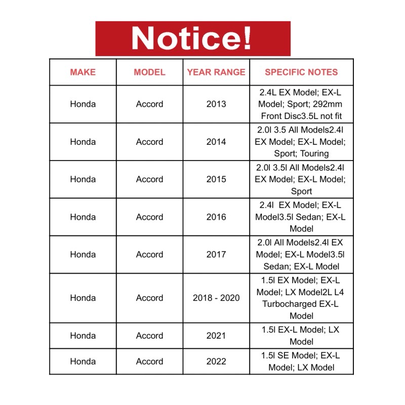 Honda | Accord | 2013 | 2.4L EX Model; EX-L Model; Sport; 292mm Front Disc 3.5L not fit |