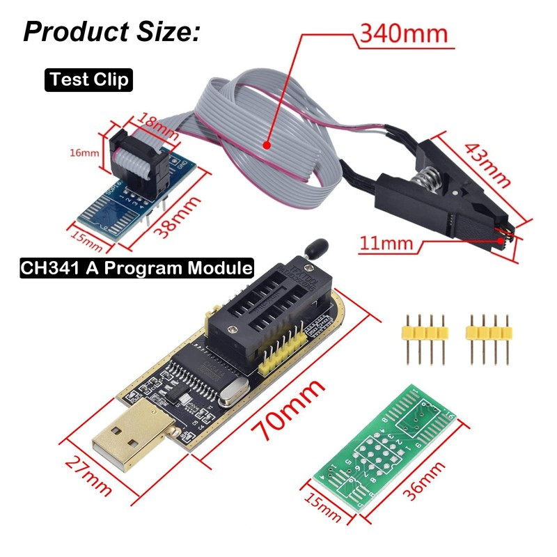 - You will get CH341A Programmer Module + Test Clip. SOIC8 SOP8 Test Clip For EEPROM 24CXX / 25CXX / 93CXX in-circuit programming