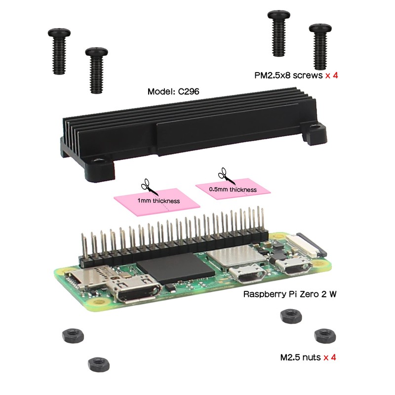 - Product Contents: Aluminum alloy heatsink (C296) x 1; M2.5 x 8 screws x 4; M2.5 nuts x 4; Thermal pad x 2; 0.03 inch (0.8 mm) thick copper plate x 1