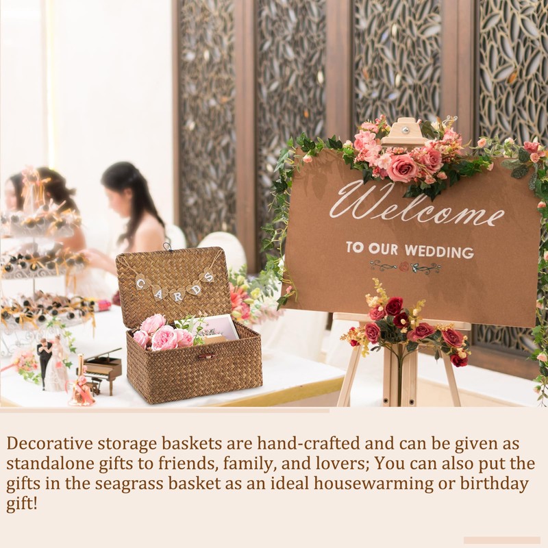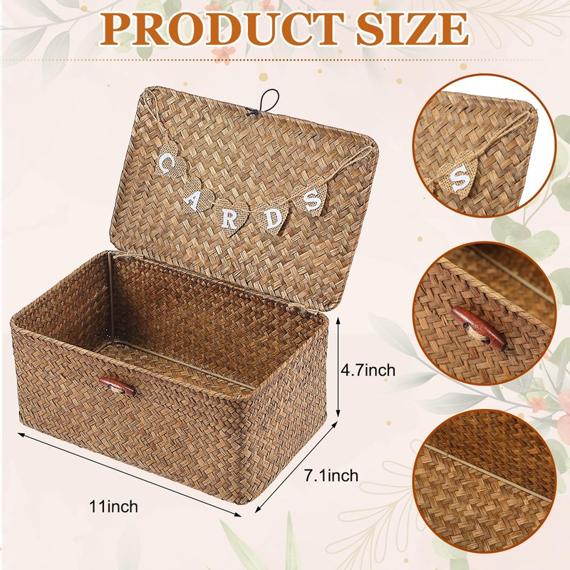 - Size and Materials: our card box measures 11 x 7.1 x 4.7 Inch and comes with a flag with the word "CARDS" and two adhesive sheets; We use natural sea grass hand woven; Its fresh and rustic charm makes it suitable for collecting wedding cards and decorating wedding, bringing a touch of natural freshness to your wedding