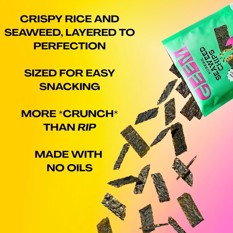 - SEAWEED REVOLUTION - Enjoy this mix of the traditional Korean roasted seaweed snack with the crunchiness of an American chip. We've reimagined seaweed by pairing it with rice crisps and sesame seeds, paired with an umami glaze.