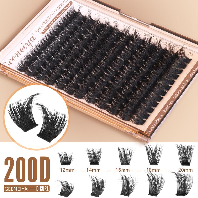 Geeneiya 200D Lash Extension Kit 12-20mm D Curl Thick Fluffy DIY Eyelash Extension Kit with Wterproof Bond and Seal, Tweezers Cosmetic Makeup - Specification: 200D Fluffy (14-18mm)