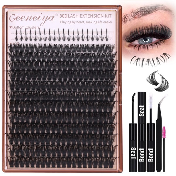Geeneiya Cluster Eyelash Extensions Kit Bottom Lash Clusters 10-20mm DIY Lash Extension Kit Wispy Volume Individual Eyelashes with Waterproof Lash Bond and Seal Applicator for Beginners