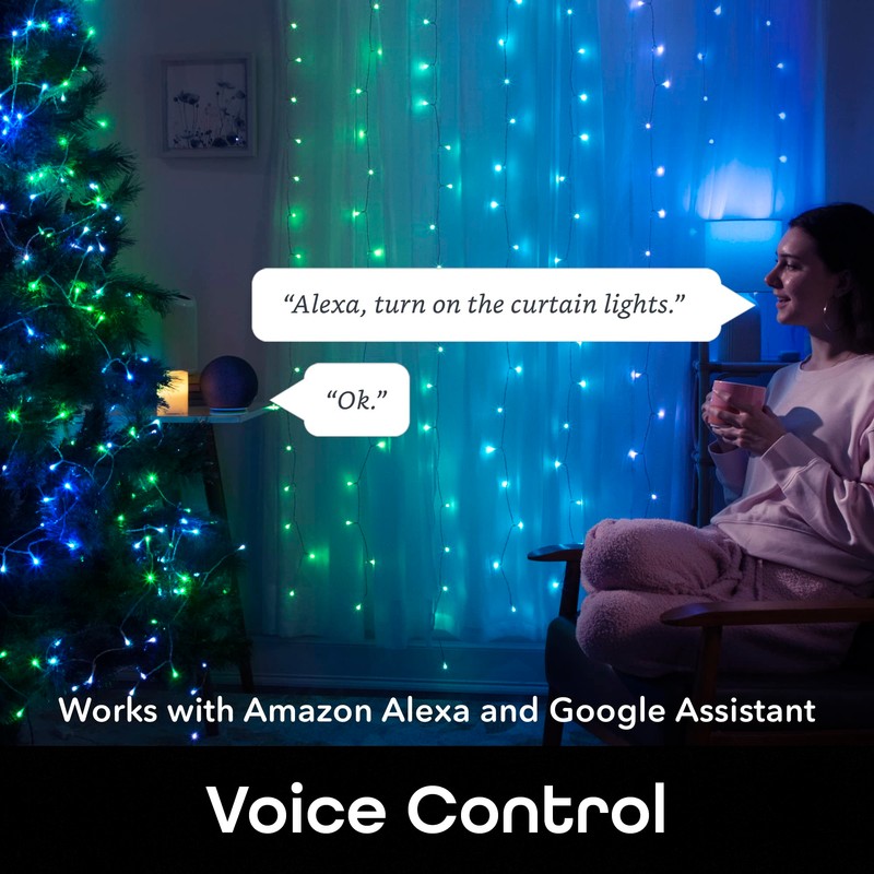 Geeni Smart Cascading Curtain Color String Lights - 6.6ft. x 5ft. Multicolor LED Strand for House, Party, Backdrop, Music Sync with Programmable Wi-Fi, Alexa, Google Home App Controlled