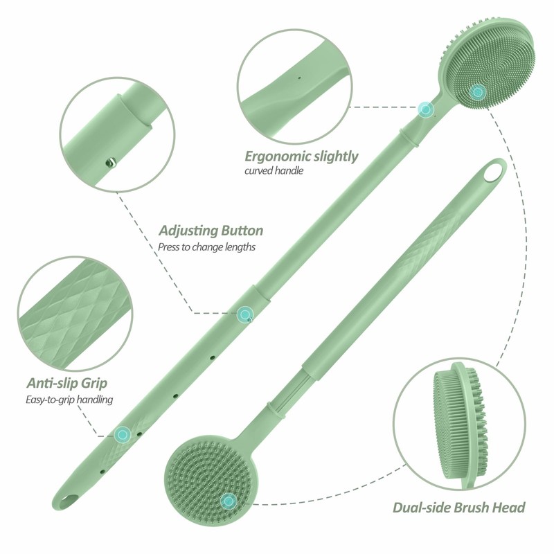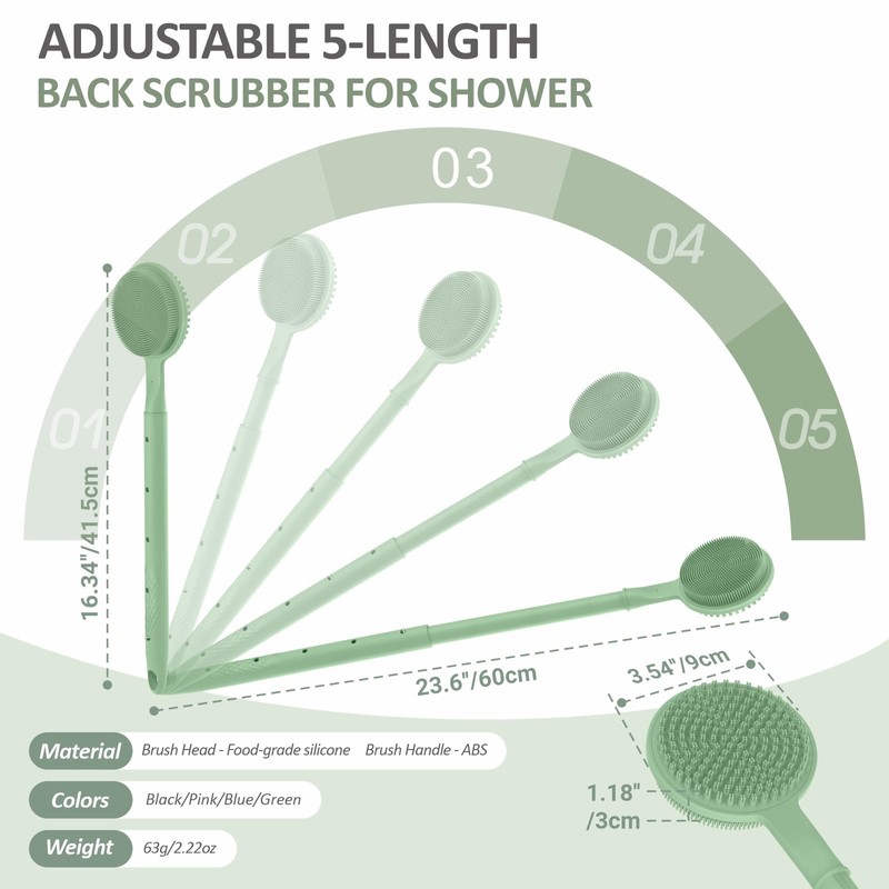 - 【Adjustable 5-Length Extra-Long Handle】Back brush's handle can be adjusted to five different lengths to meet different needs. Shortest one is perfect for hand-hold brushing, medium length for scrubbing back and legs, longest one for brushing feet and toes without bending, which is especially friendly to seniors, pregnant and people with limited mobility. The unique extendable handle brings excellent non-slip experience to your shower!