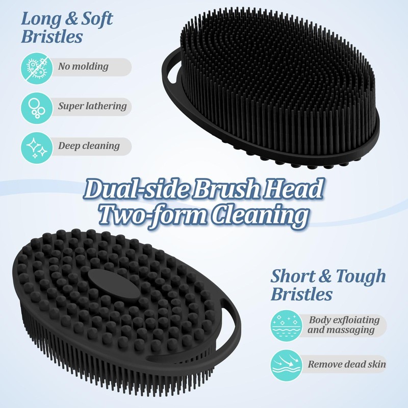 - 【Soft Bath Brush - Dual-side Usage & Built-in Hanging Loop】Body brush is also made of food-grade silicone and has two different sides to provide two different brushing experiences. One side with one Inch long bristles for quick lathering and easy body cleaning; Other side with short and tough dots for exfoliating and massaging. Built-in large hanging loop provides easy hanging to all kinds of hooks in you bathroom.