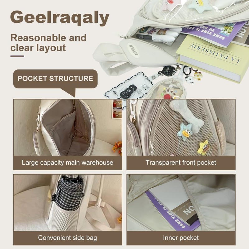 - 3. 【Pocket structure】: There is a main large pocket and an inner pocket. There is a transparent zipper pocket and a pad on the front of the backpack. There is a side pocket and a D-shaped buckle with transparent coin purse on the side.
