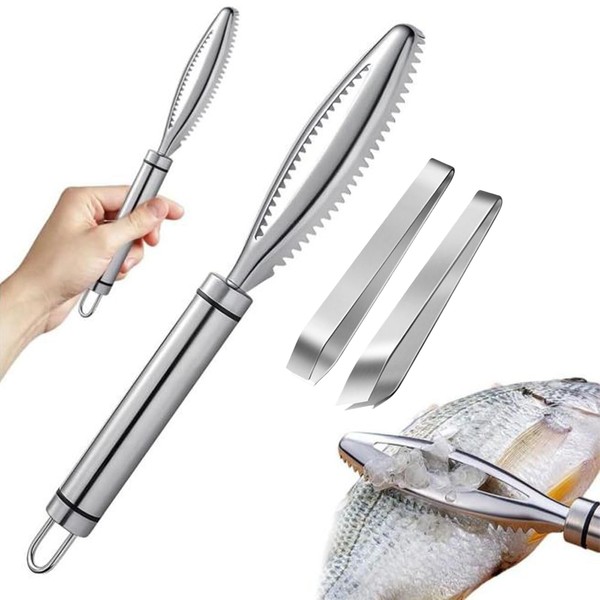 Geerow 304 Stainless Steel Fish Scaling Tweezer Tweezer Fish Scaling Scaler No Splitter Fish Scaler Scaler 1 Pack + 2 Tongs