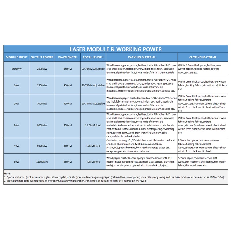 Efficient Work:with adjustable focal length (5.5W/ 10W/ 20W) or fixed focal length (30W/ 40W/80W), flexible and easy to use, ensures fast, clear engraving with high efficiency, high precision.