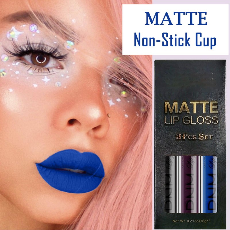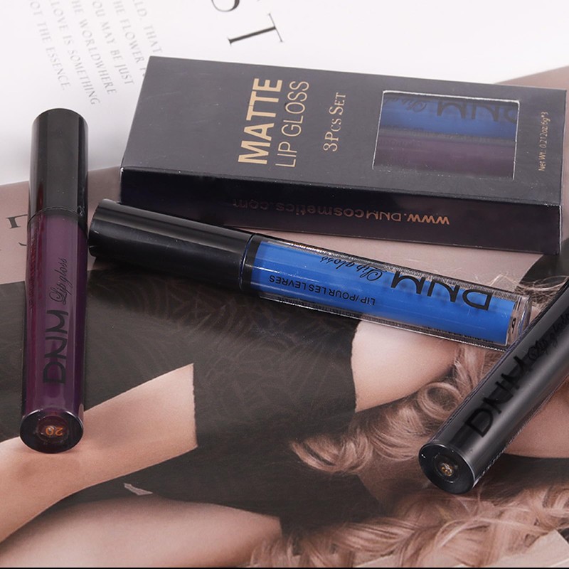 - 3Pcs Liquid Lipstick Set This lip gloss set contains 3 popular matte liquid lipsticks. Highly pigmented black lipsticks, blue lipsticks, and deep purple lipsticks that are very stylish and versatile.