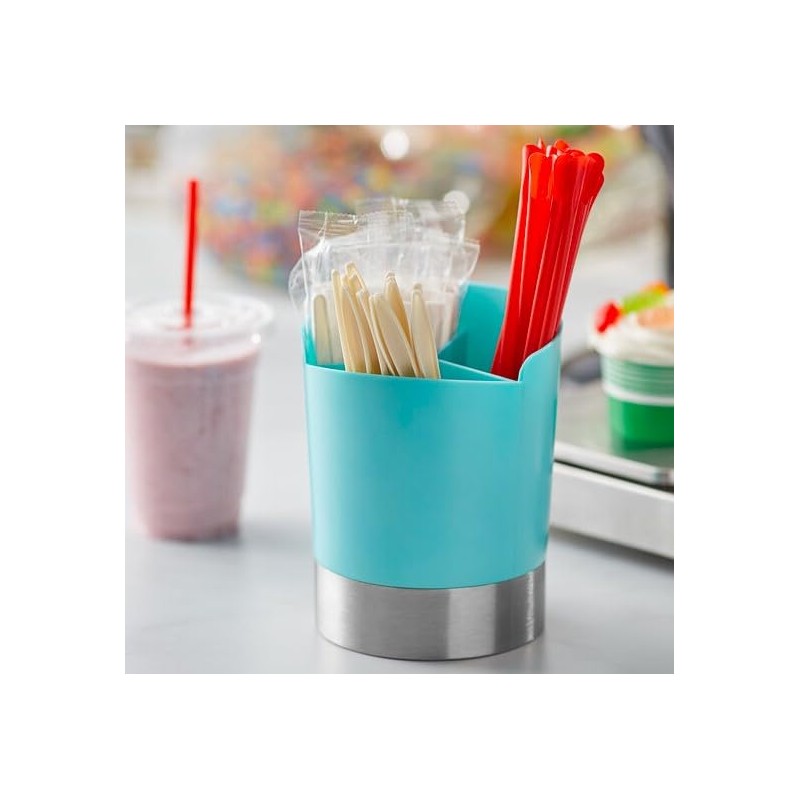 Enhance the efficiency and presentation of your countertop with this Blue 3-Compartment Cylinder Straw & Utensil Holder with Stainless Steel Base. Perfect for cafes, restaurants, and self-serve stations, this holder provides a sleek and organized way to display essential items like straws, coffee stirrers, and utensils. Its vibrant blue color adds a unique touch to your setup, creating an inviting display for guests. This utensil holder is crafted from lightweight, easy-to-clean plastic and features a durable stainless steel base for added stability. The 3-compartment design allows you to sort different items conveniently, keeping everything organized and within reach. Additionally, its elevated structure helps maintain hygiene by preventing utensils from touching the countertop surface. Measuring 5 1/4" in diameter and 6 3/4" in height, this holder fits easily into compact spaces, making it a smart choice for crowded countertops. Whether used for straws at a frozen yogurt shop or stirrers at a coffee station, this holder is a versatile and efficient addition to any establishment. Combine it with other colors for a coordinated setup that is both functional and visually appealing. Dimensions: Diameter: 5 1/4" Height: 6 3/4"