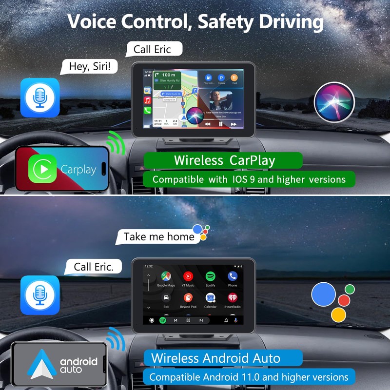 - WIRELESS CARPLAY & ANDROID AUTO: Gegaibe CarPlay screen features the latest voice control technology, simply connect it to your phone and access calls, map navigation, emails, music and more with the help of Siri/Google Assistant!
