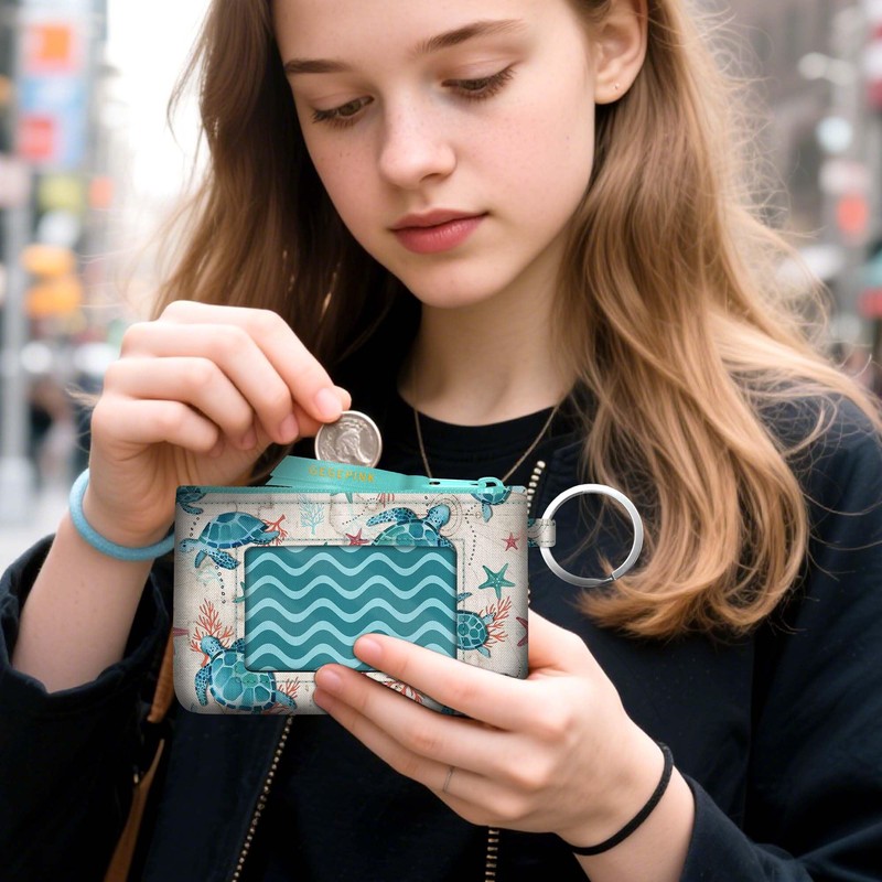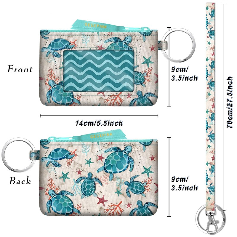 GEGEPINK ID Case Keychain Wallet with Lanyard RFID Minimalist Water Resistant Small Coin Pouch with Clear ID Window Cute Zipper Coin Pouch, Sea Turtle-Keychain Wallet, 3x5 INCHE