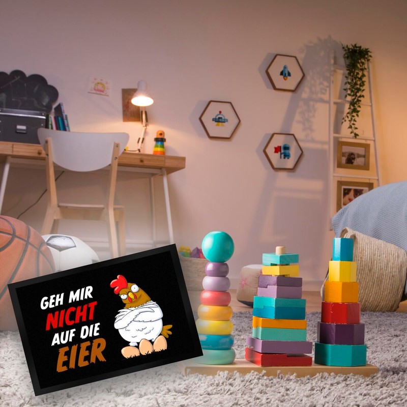 • On the doormat is the saying: Geh mir nicht auf die Eier. As a motif you can see an annoyed chicken standing behind his chicken eggs. The background is black.