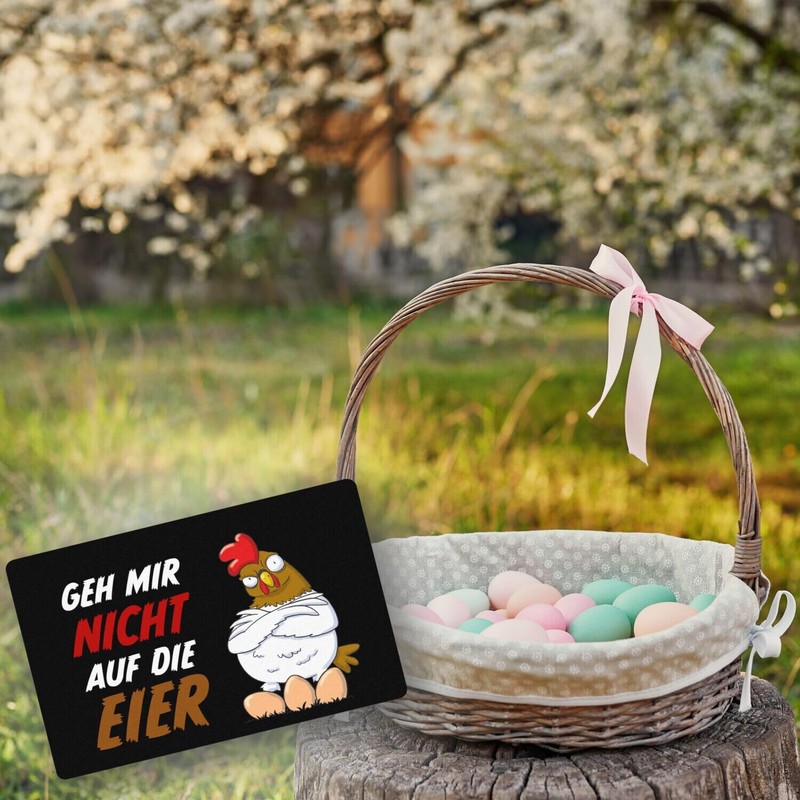- On the doormat is the saying: Geh mir nicht auf die Eier. As a motif you can see an annoyed chicken standing behind his chicken eggs. The background is black.