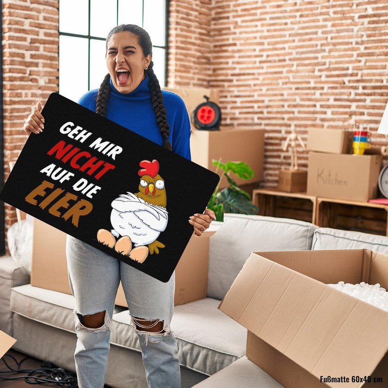 - Box contents: 1 x "Geh mir nicht auf die Eier" doormat in 40 x 60 cm without rim with annoyed chicken