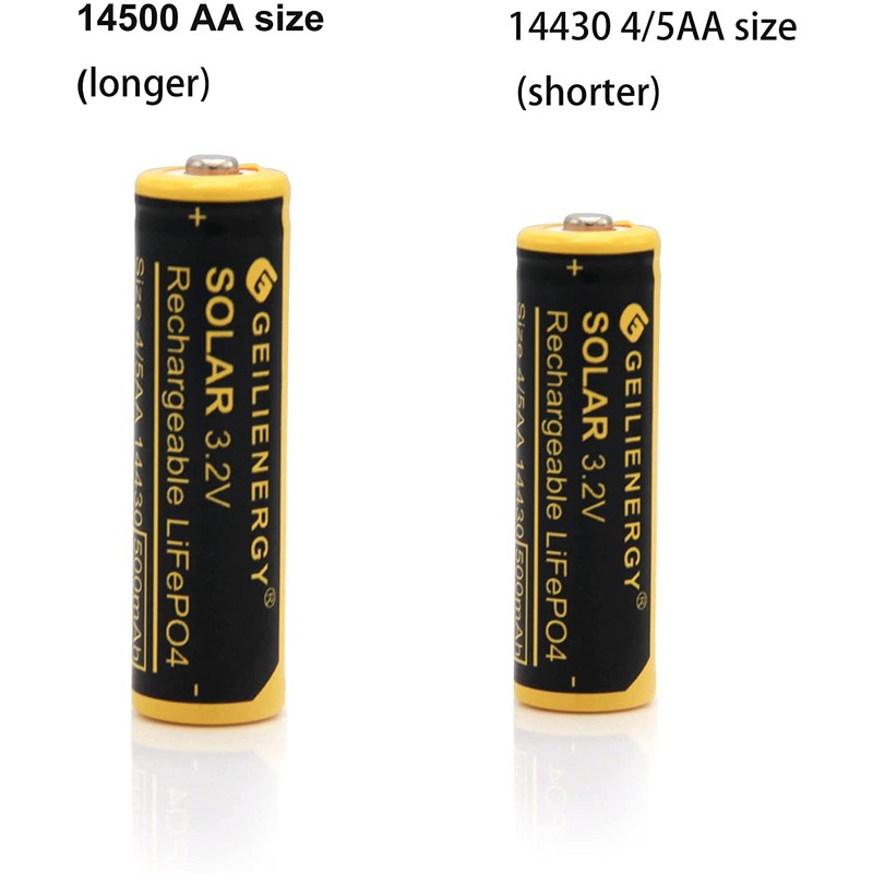 - Please Check the Size and VOLTS Before You Place an Order .SIZE : the 14430 is shorter 1/5 inch than the14500-size and AA size, VOLTS : LiFePO4 (Lithium Iron Phosphate) battery, VOLTS is 3.2V, NOT a replacement for 1.2V Ni-MH battery and 3.7V li-ion battery