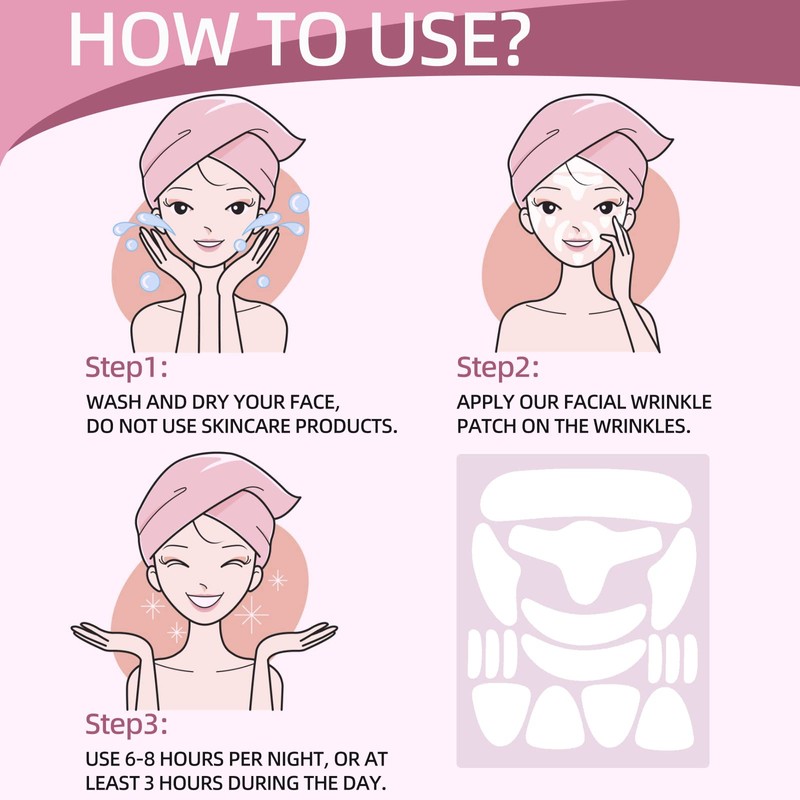 - FACE WRINKLE PATCHES:With strong stretching & guiding, instantly lift sagging face skin and reduce wrinkles. Target frown, crow's feet, smile & perioral lines, relieve sagging & wrinkles, reshape contour for firmer, younger skin.