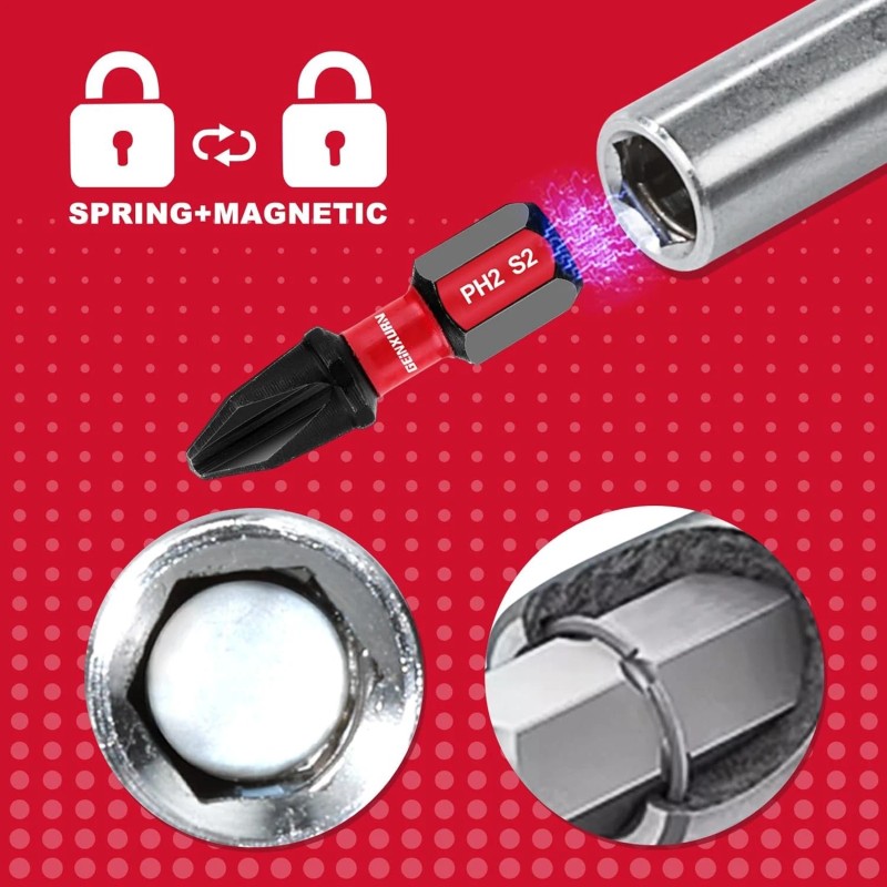 - SPRING LOCK+MAGNETIC — The magnet is located inside the tube and the spring locking mechanism, securely holds the bits in place, reduces the possibility of wobble or fall out, ensures the accuracy of your power drill or other devices.