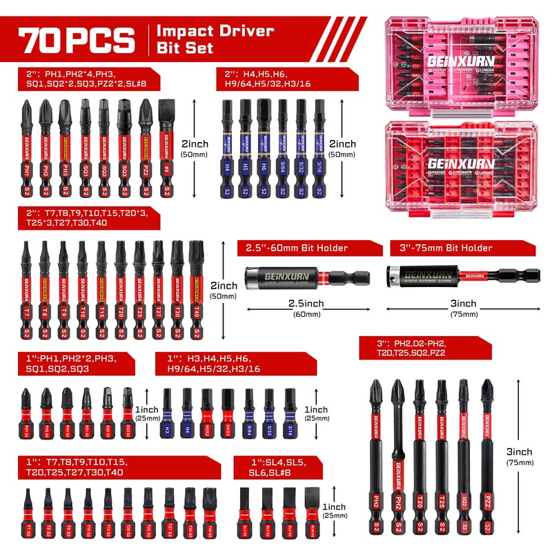 Geinxurn 70Pieces Impact Screwdriver Bits Set, Magnetic S2 Steel 1”/2”3”Phillips/Square/Torx/Slotted/Hex/Pozi Bits Tips and Impact Bit Holder with Red Storage Box Case