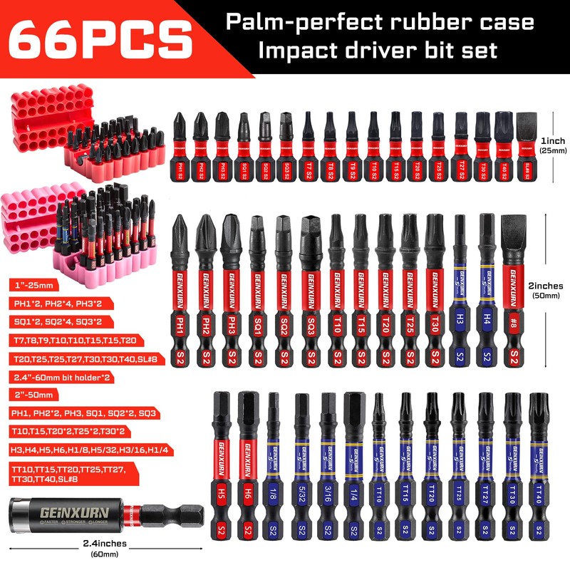 Geinxurn Impact Screwdriver Bits Set, 66 Pieces 1”/2”Multi Head Magnetic S2 Steel Driver Bits PH/SQ/Torx/Slotted/Hex/Security Torx With Soft Base