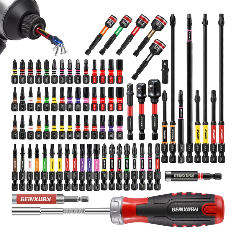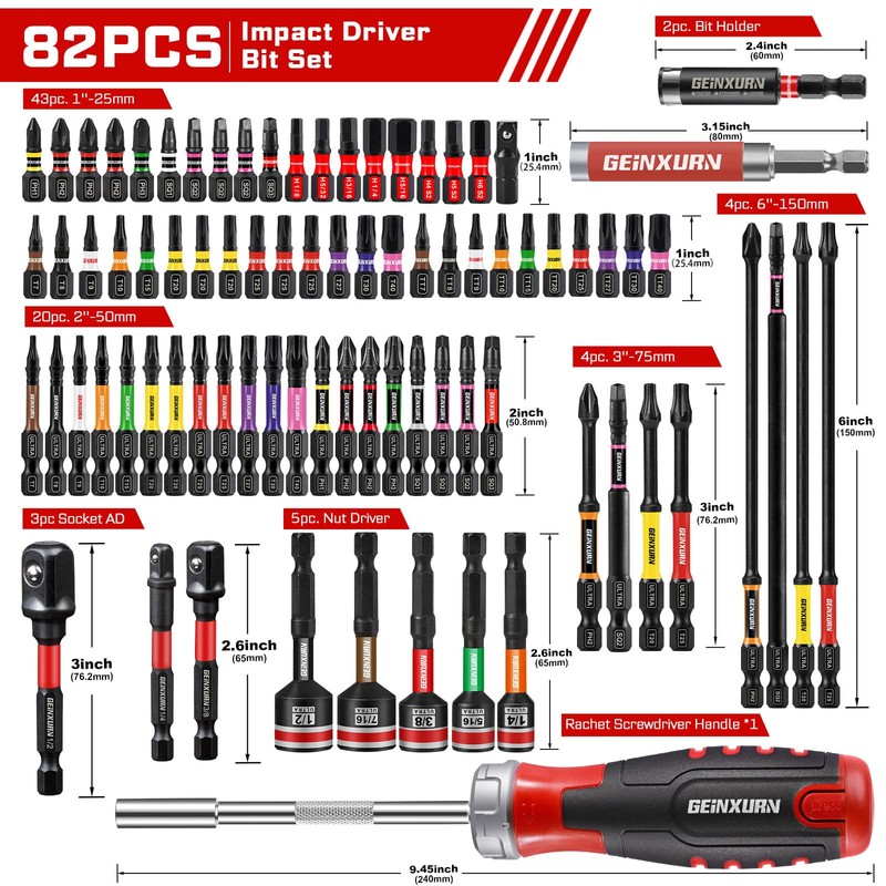 Geinxurn Impact Screwdriver Bits Set, Magnetic S2 Steel Phillips/Square/Torx/Hex 82Pieces Insert Power Bits Tips with Impact Bit Holder and Impact Nut Driver and Rachet Screwdriver Handle