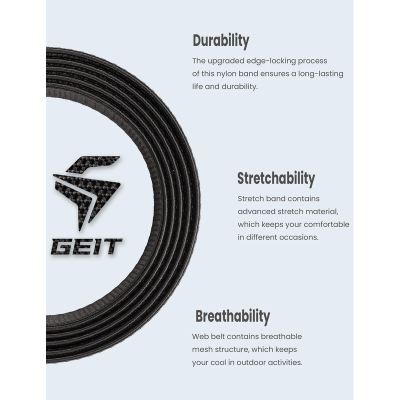 • STRETCH NYLON:The stretch belt features advanced elastic material and breathable mesh structure, which keeps you comfortable and cool on different occasions. The upgraded overlocked process also ensures long-lasting durability