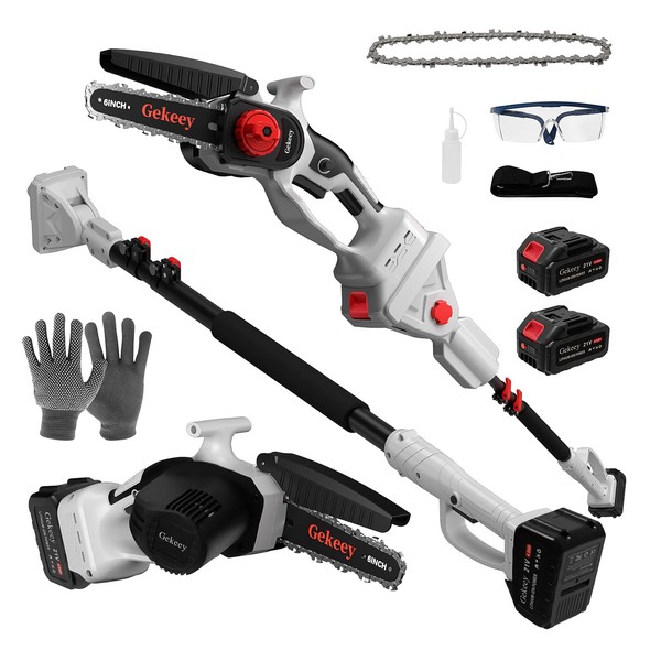 Gekeey 2-in-1 Electric Pole Saw for Tree Trimming, 6 Inch Cordless Mini Chainsaw with Max 15 FT Extension Pole, Battery Powered Pole Chainsaw with 2PCS 4.0 Ah Batteries, Adjustable Head for Gradening