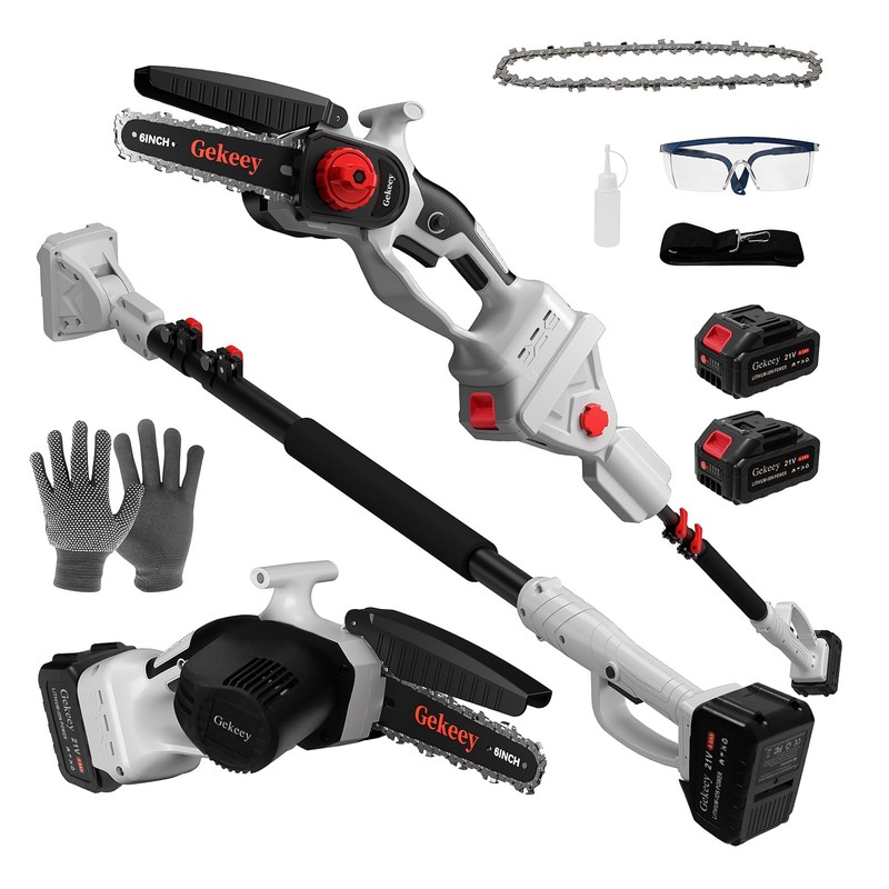 - 2-IN-1 Pole Saw & Mini Chainsaw: This cordless pole saw features a 6-inch mini chainsaw and adjustable extension pole letting you easily trim both high branches and low bushes without needing a ladder The handheld chainsaw detaches for ground-level cutting while the extended pole reaches up to 10 feet for overhead work Its lightweight design and ergonomic grip make pruning comfortable and efficient